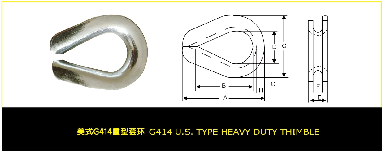 The U.S. G414 Type Heavy Duty Thimble is a robust and durable fitting designed to protect wire ropes from wear and deformation at the eye connection. Manufactured from high-quality carbon steel and hot-dip galvanized for superior corrosion resistance, this thimble provides long-lasting performance even in harsh marine and industrial environments.