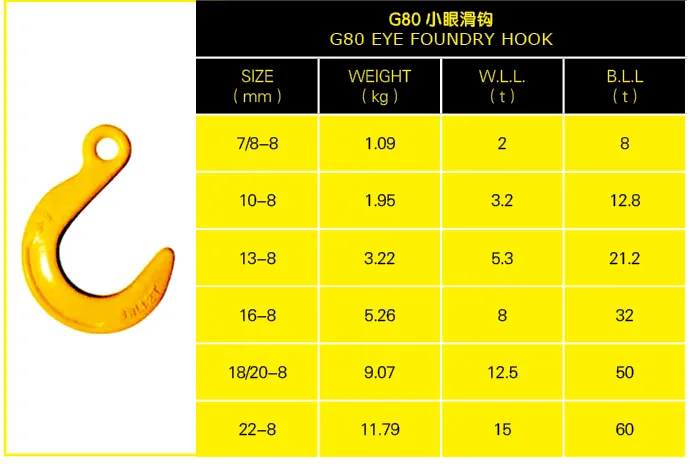 Each hook is forged, heat-treated, and proof-tested, ensuring compliance with EN 1677 and other international standards. With a robust structure and high load capacity, the G80 Eye Foundry Hook is suitable for industries where performance and safety are critical.