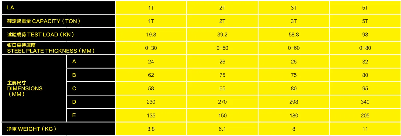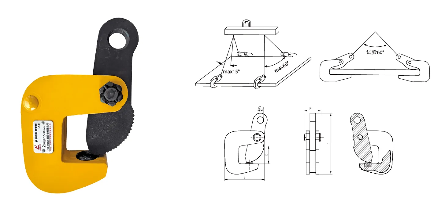 • Two pieces of clamp are used for the testing, but 2 pieces of 4pieces are recommended for lifting operation, balance beam is needed for big size steel plate.